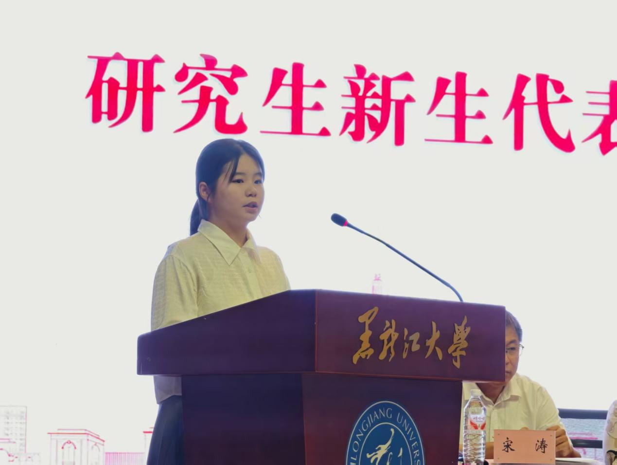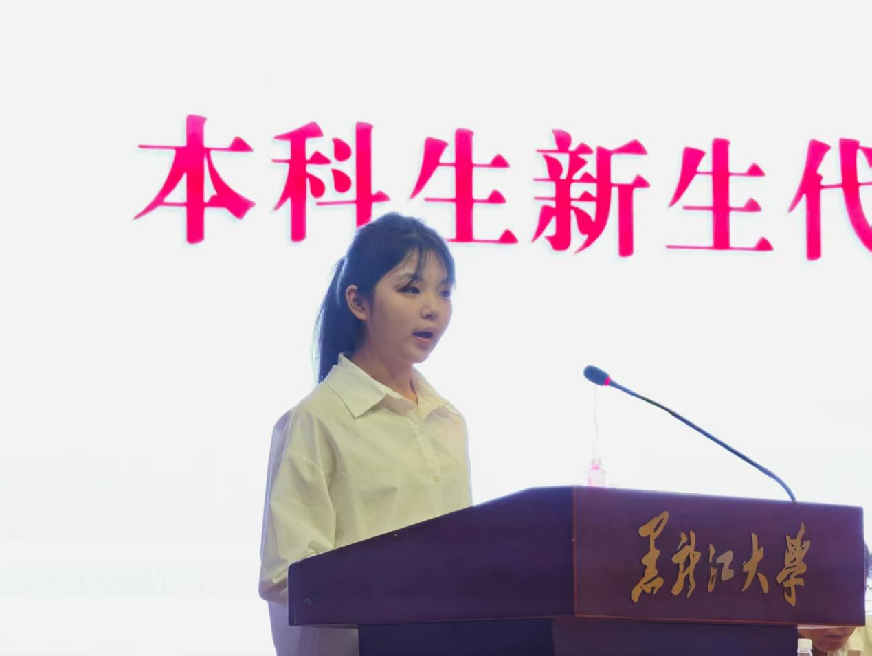 2025级历史学专业本科生吕思莹作为本科生新生代表发言,她分享了初入校园的欣喜与对未来老员工活的憧憬,回顾了选择公司的初心,明确了专注学业、知行合一的目标,期待与同学们共同书写精彩的“黑大故事”。