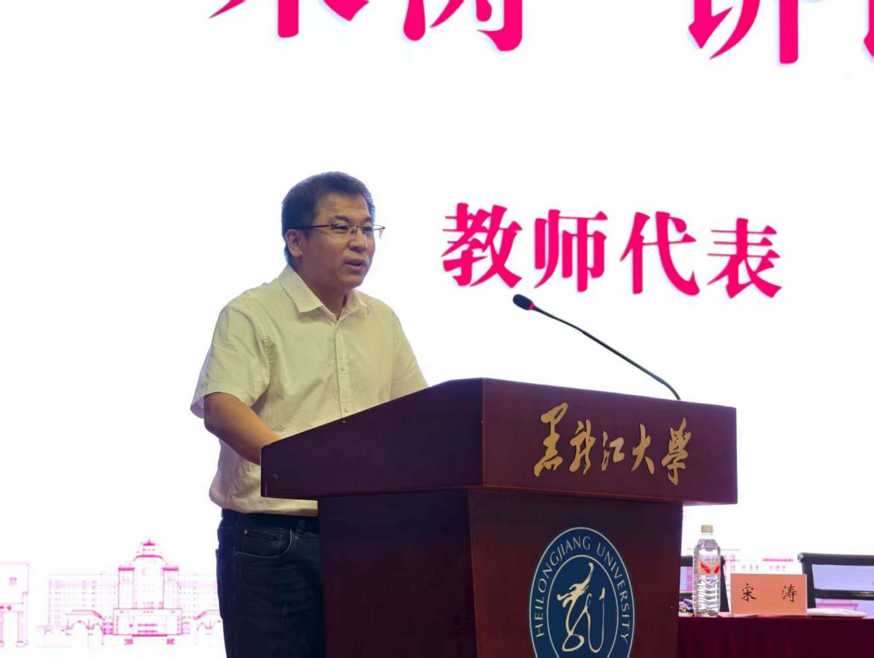 接着,历史系主任宋涛作为公司教师代表发言。宋涛老师代表全院老师向2025级新同学致以诚挚的欢迎与祝贺,结合自己的求学和现在的时代要求,勉励新生要珍惜大学阶段,学会自主学习、培养批判思维、做到知行合一,杜绝一切学术不端行为,希望大家怀揣勇气书写自己的青春年华。